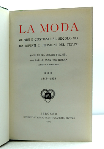 In 16mo (cm 20x13). Opera completa in 3 volumi. Legature in tela scritte e fregi dorati ai piatti e ai dorsi, tagli colorati in verde, sguardie in carta decorata. Numerose illustrazioni in b/n e tavole a colori fuori testo (cromolitografie) . Vol. I° (1790-1817) pag. 173. Vol. II° (1818-1842) pag. 158. Vol III° (1843-1878) pag. 157 (piccolo taglietto al dorso). -- La moda e il costume dal 1790 al 1878 illustrata attraverso le opere d'arte esposte in musei europei.
