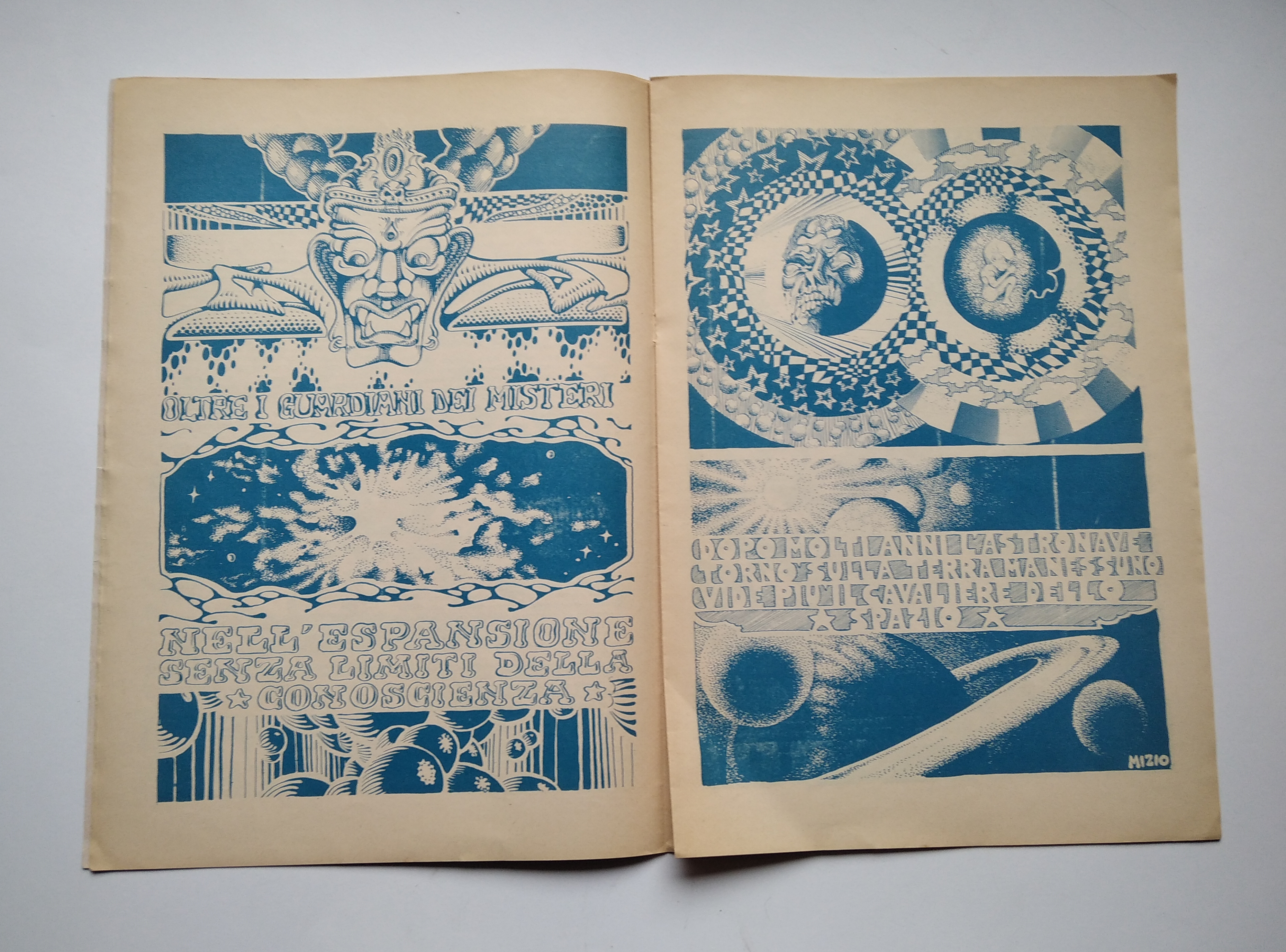 Brossura (cm 29 x21) pag 12+4 (copertina). Collaboratori: Caza, Giulio Tedeschi, Franco Beltramelli, Piero Naselli e altri Freak ticinesi. Rivista underground del Canton Ticino fondata da Antonio Rodriguez nel 1969 e pubblicata fino al 1975 in due serie distinte. La seconda serie fu distribuita in Svizzera, Italia, USA, nel circuito IAP. -- Ogni numero è un'esplosione d'illustrazioni a colori con testi scritti a mano in un intarsio di disegni allucinati e simbolismi psichedelici (Matteo Guarnaccia)