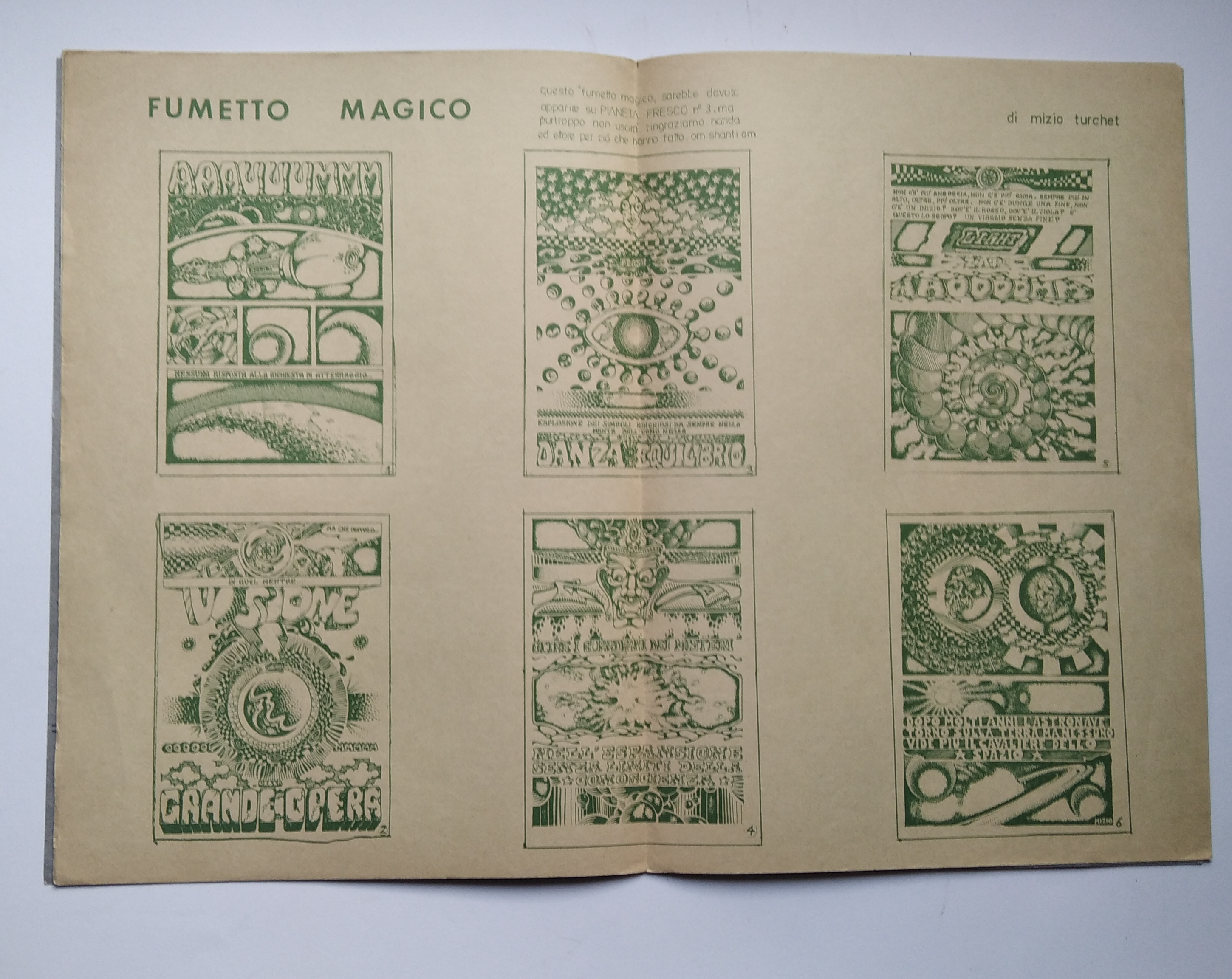 Brossura (cm 29 x21) pag 12+4 (copertina). Collaboratori: Mizio Turchet, Shantianada Gianni, Franco Beltramelli e altri Freak ticinesi. Disegno di copertina di Rupert V.D. Linden. Rivista underground del Canton Ticino fondata da Antonio Rodriguez nel 1969 e pubblicata fino al 1975 in due serie distinte. La seconda serie fu distribuita in Svizzera, Italia, USA, nel circuito di Re Nudo e Stampa Alternativa. -- Ogni numero è un'esplosione d'illustrazioni a colori con testi scritti a mano in un intarsio di disegni allucinati e simbolismi psichedelici (Matteo Guarnaccia)