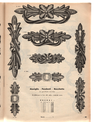 Catalogo illustrato (cm 34x25) pag. 31 tutte illustrate, lievi mancanze alla copertina ma comunque integro e in buono stato. -- Maniglie per mobili, attaccapanni bocchette, pendenti, tutto con i relativi prezzi.